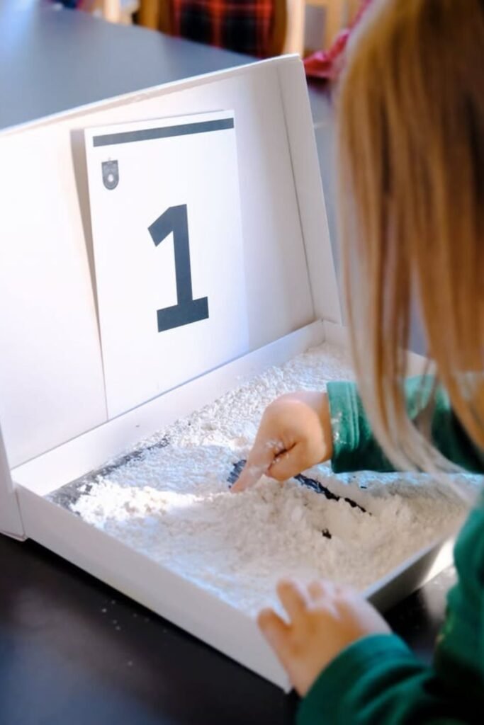 Flour in a shallow tray can hold attention longer than a pencil ever will. Tape a number or letter card upright in front of your child and let them copy it right into the powder.