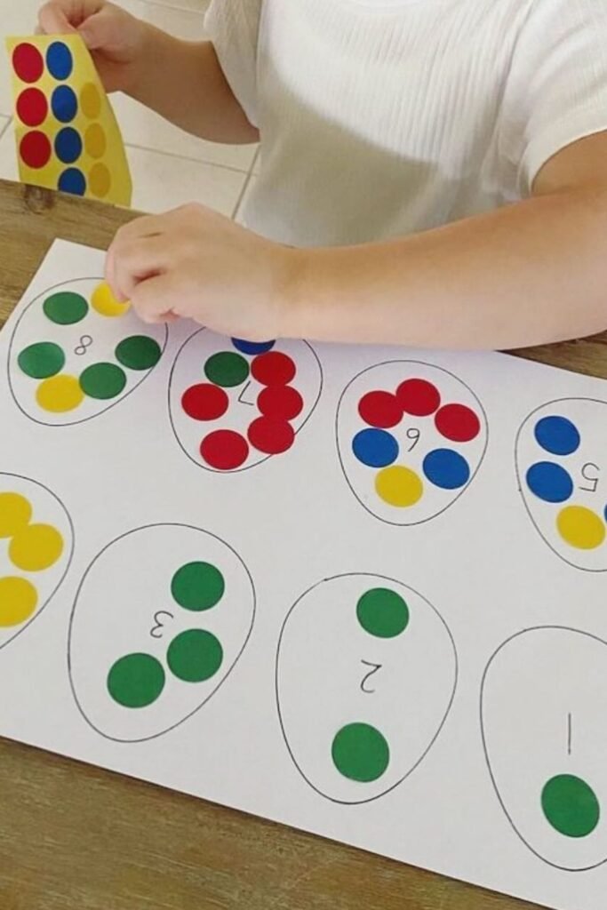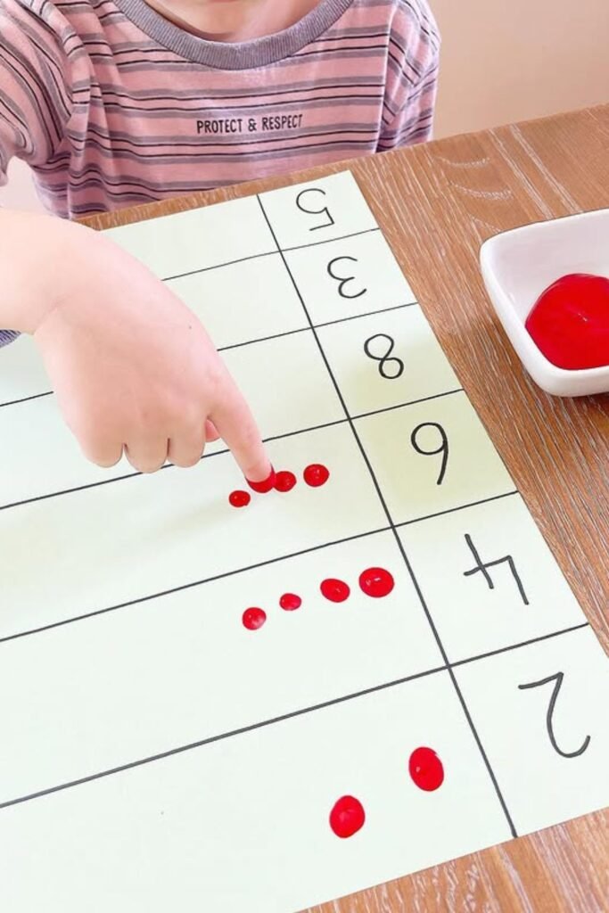 Then ask them to match each number with the proper number of dots. Dipping a finger into paint is more fun than using a pencil, which maintains kids’ attention longer.