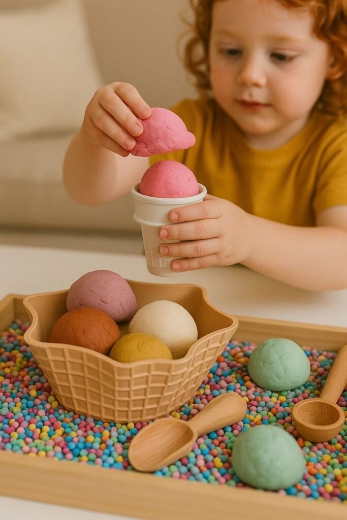 Pretend play becomes powerful learning when you lean into it. Set up a small “ice cream shop” using playdough scoops, bowls, cones or even real kitchen cups.