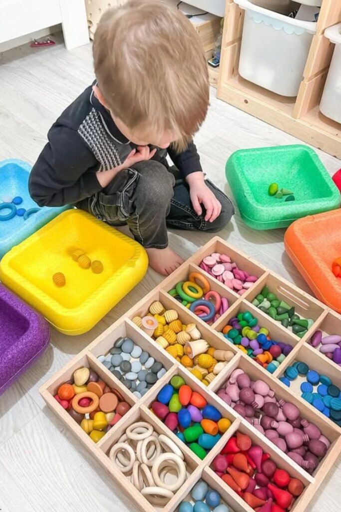 Bright colors naturally pull kids in, so use that to your advantage. Place a few colored bowls or trays on the floor and scatter mixed pieces in the center.