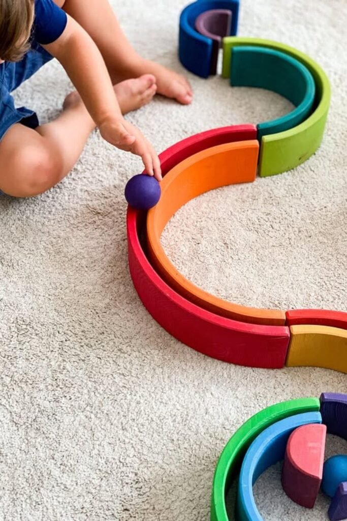 Few things grab attention faster than watching a ball roll. Curved wooden pieces on the floor instantly turn into a mini track.