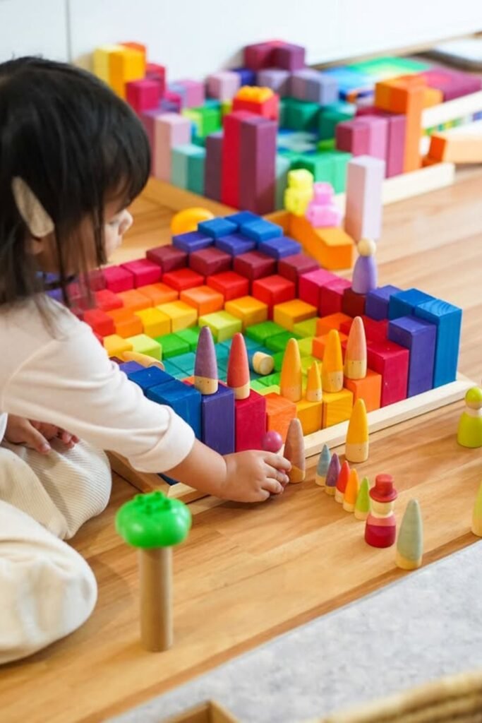 Big piles of wooden blocks open the door to serious thinking. Spread them out on the floor and let your child decide what to create a house, a rainbow wall, a pretend town.