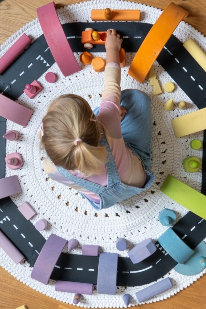 Circle the space with a simple road and watch imagination take over. Wooden blocks become buildings. Small cars turn into busy drivers.
