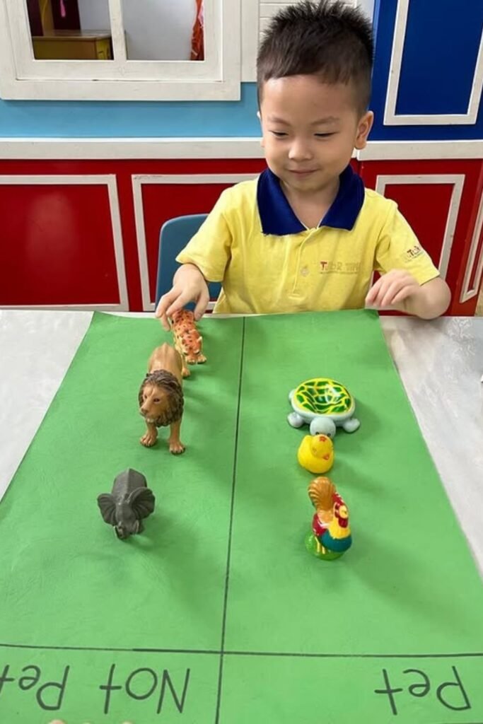 Animals naturally grab a child’s attention, so use that curiosity to introduce simple categories. Draw a line down a piece of pape label one side “pet” and other “not pet.”