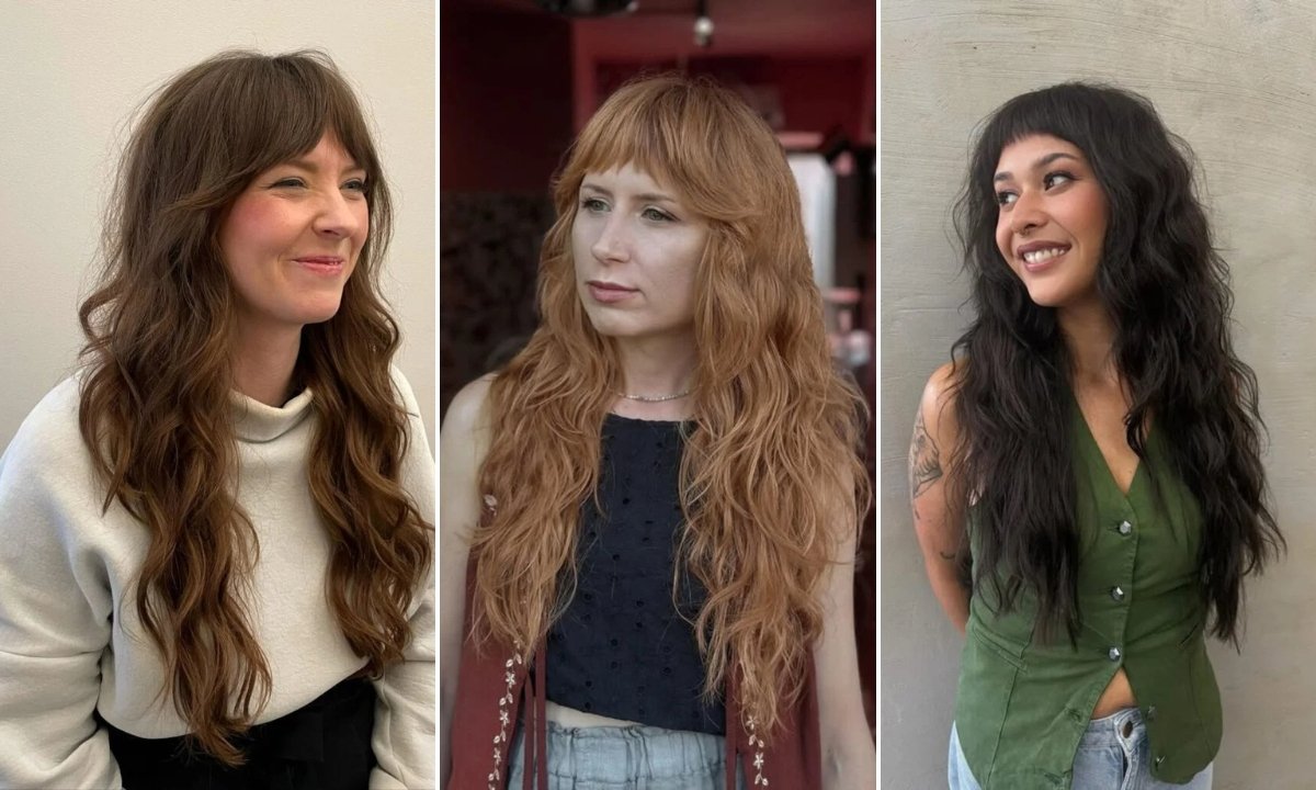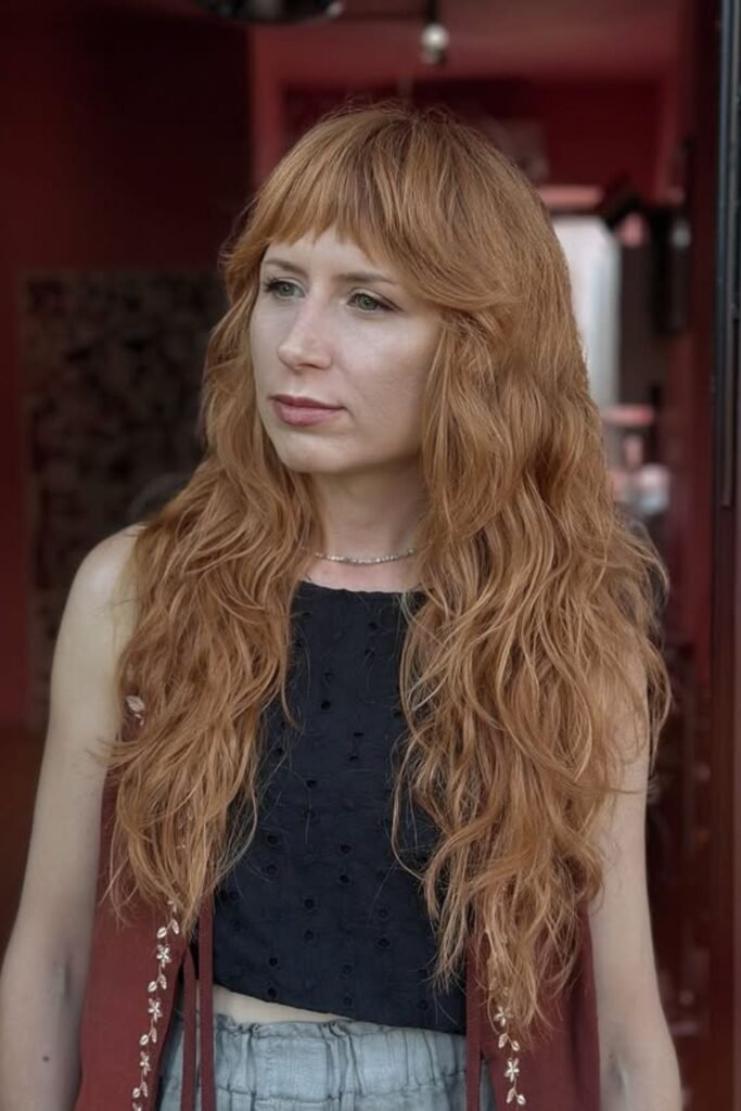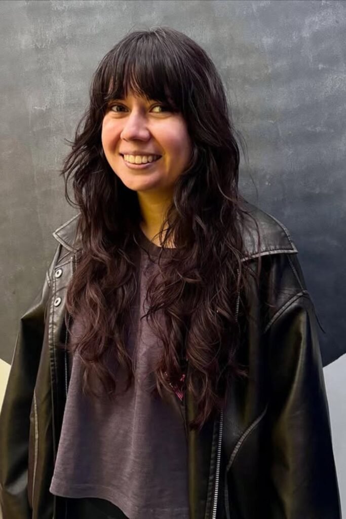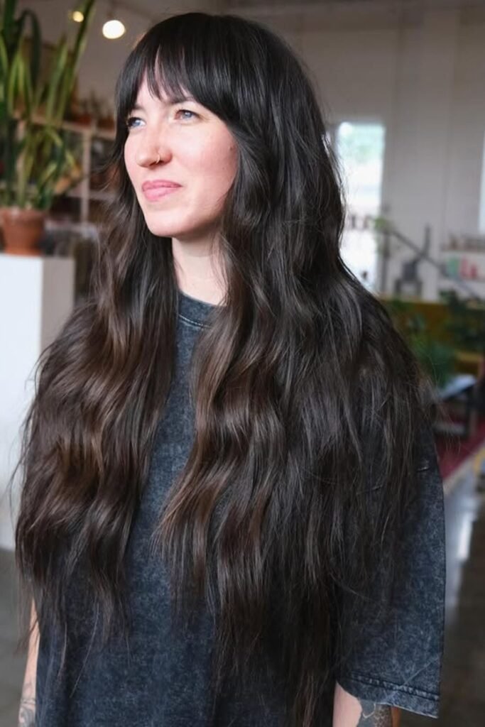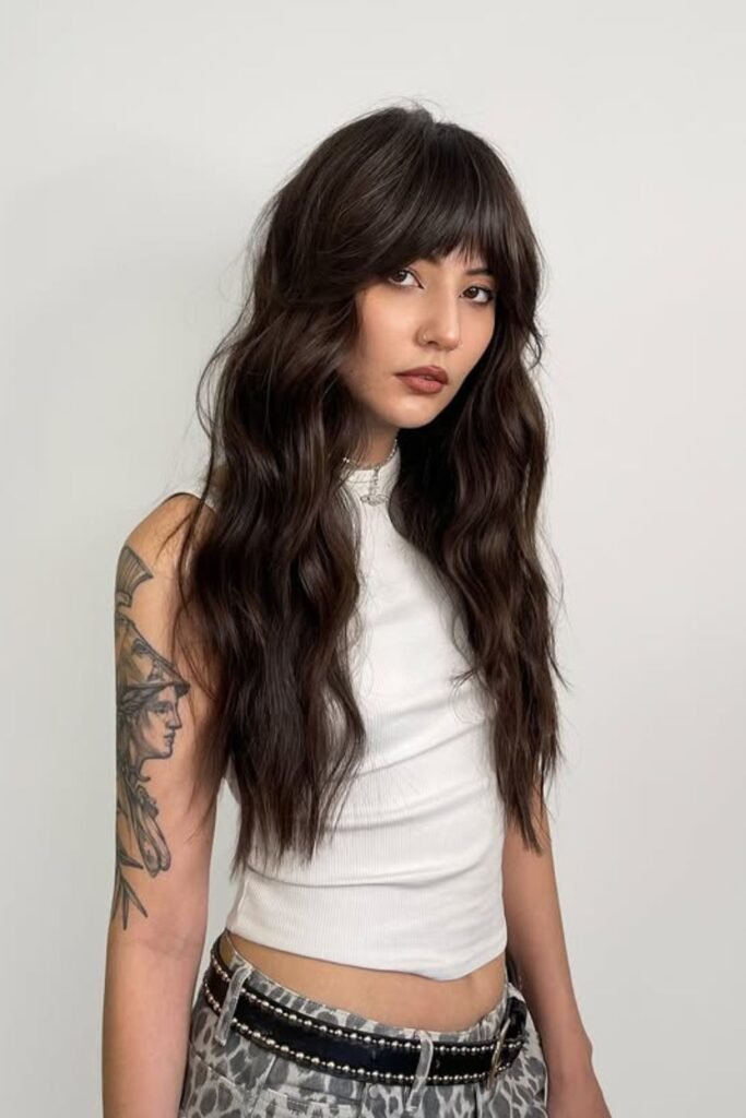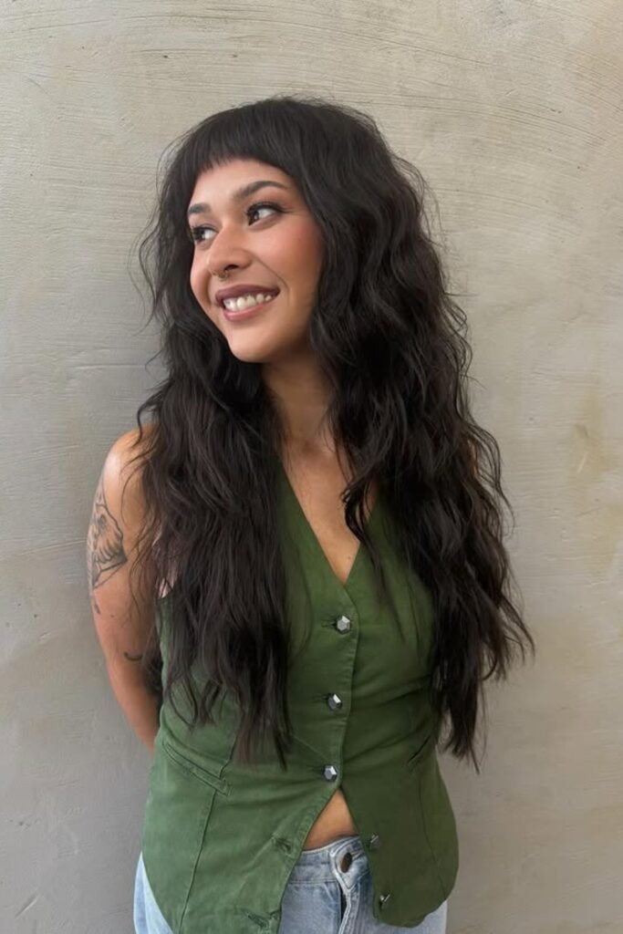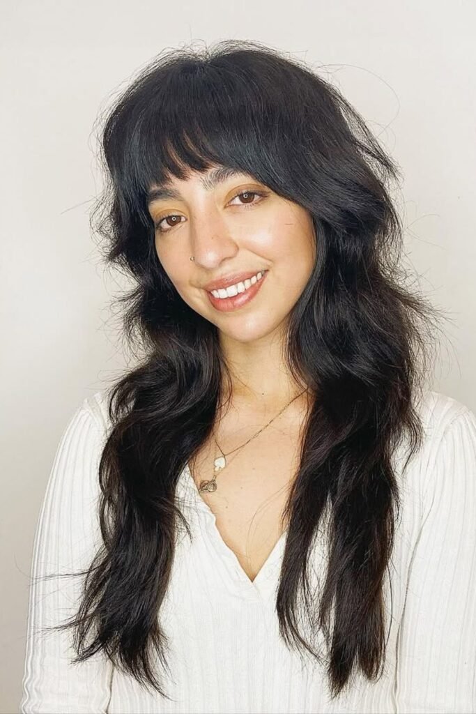 Short bangs like these change the whole vibe of a long shag in one move. The long, wavy layers keep everything soft and wearable.
