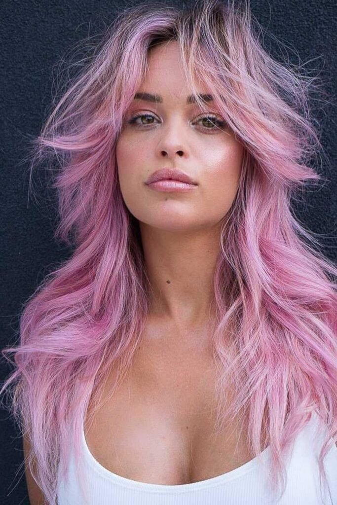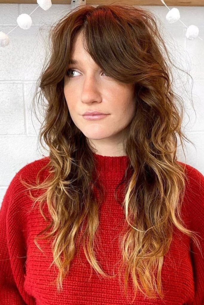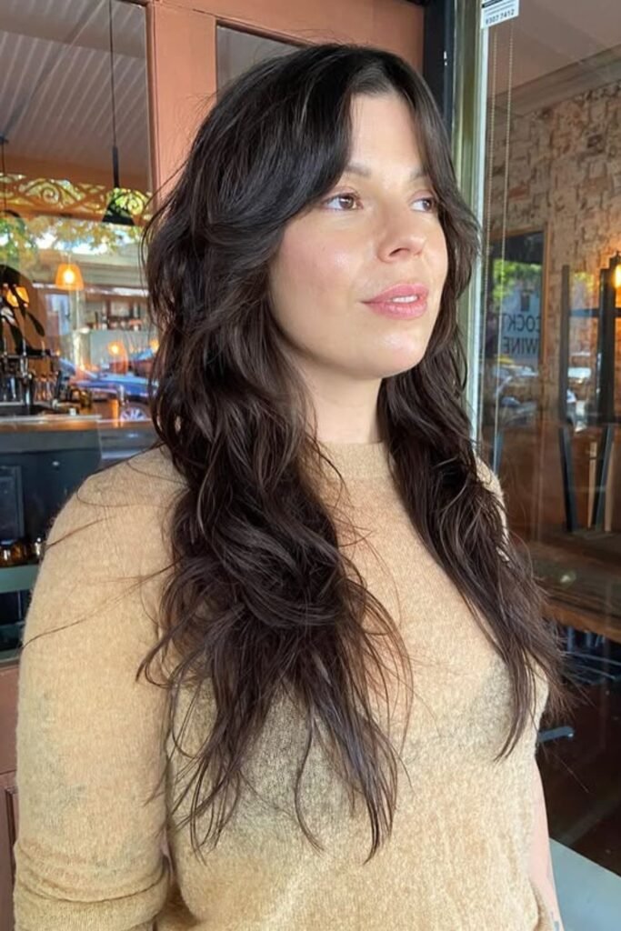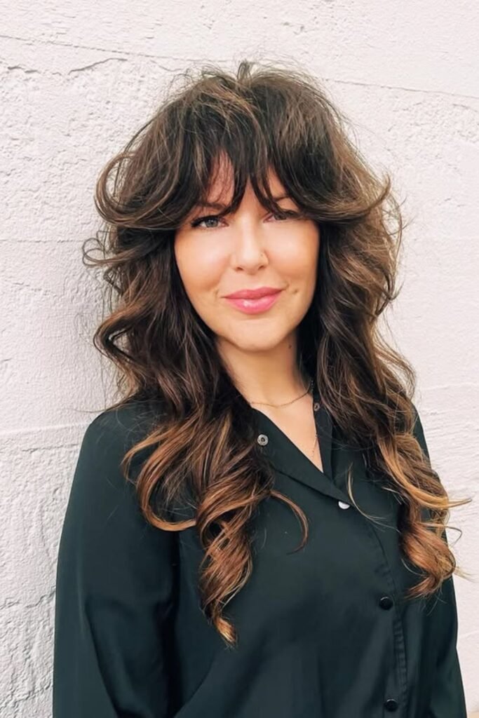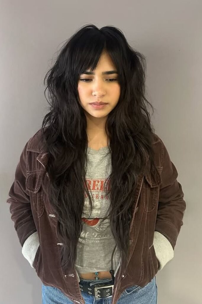 Long bangs that sweep into the sides keep the front soft while the layered length stays wild and free.