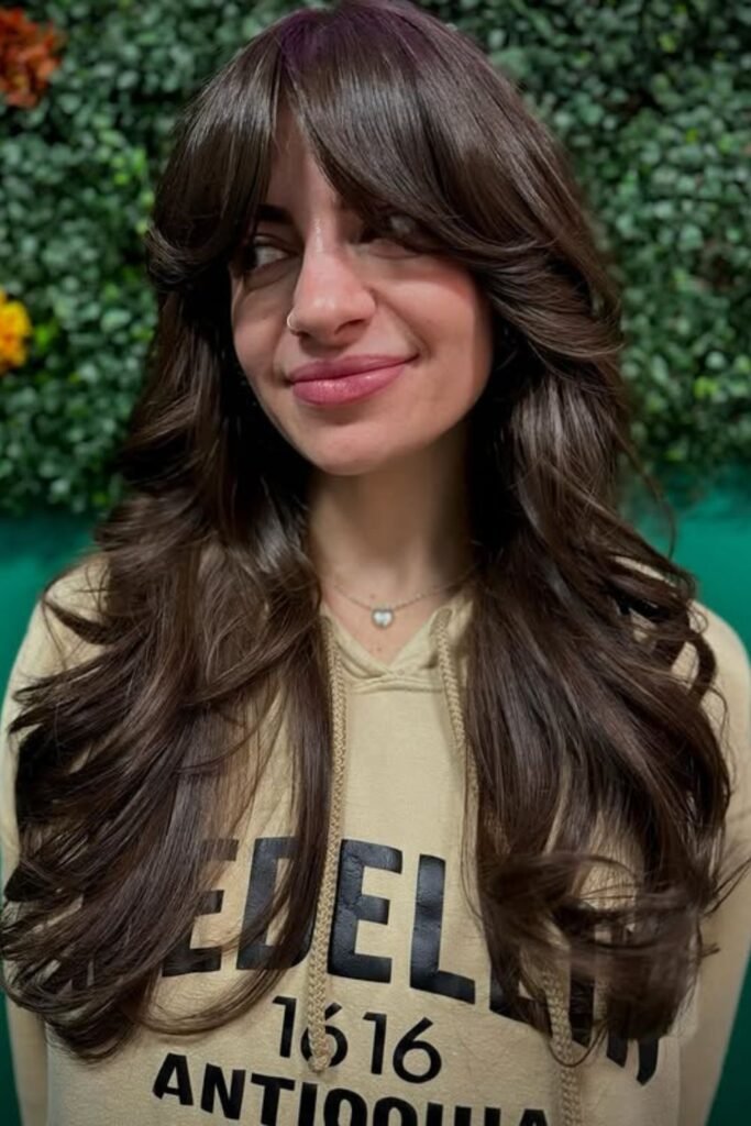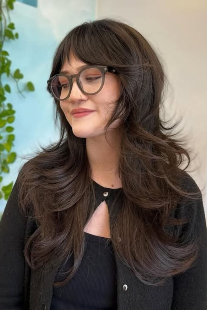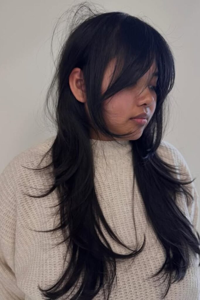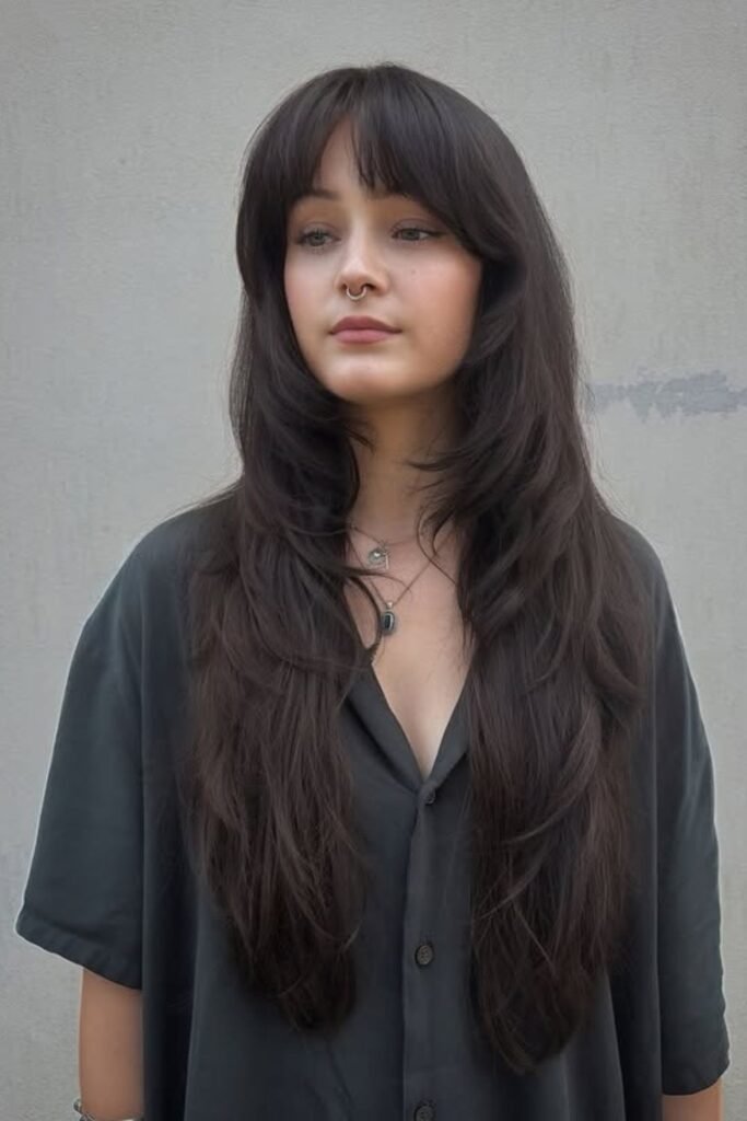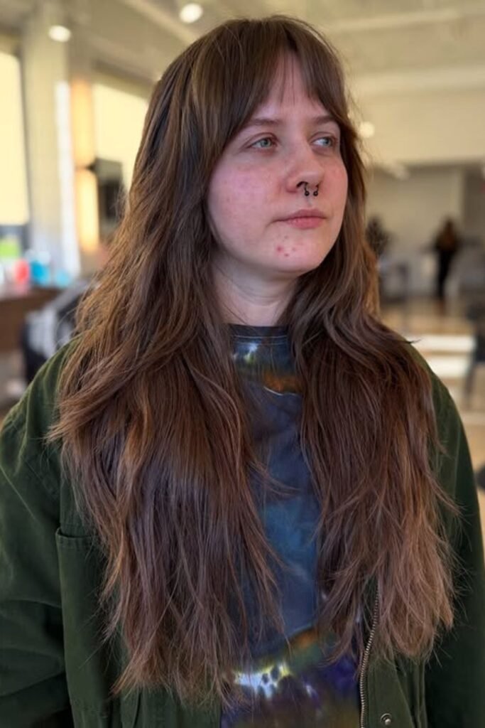 Bottleneck bangs give a long shag a gentle frame without closing off your face. The center stays short while the sides blend into the layers of the cheek.