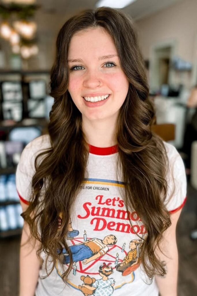 The middle part and lets the shorter face layers fall naturally without forcing volume at the crown. This version works great for straight-to-wavy hair that holds a soft curl.
