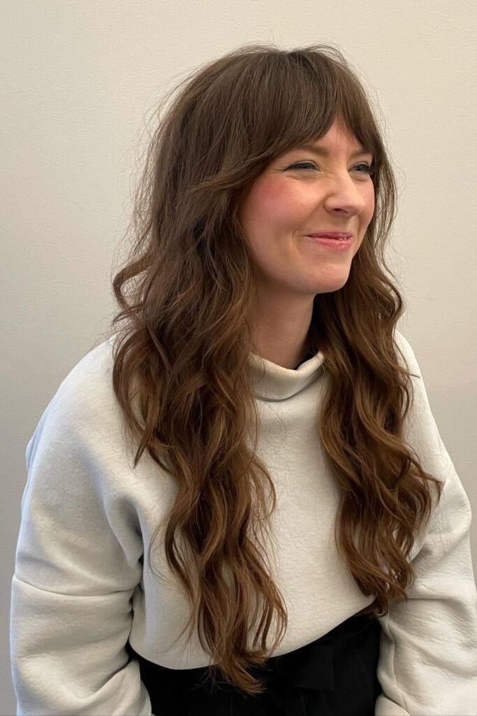 Gentle waves like these keep a long shag looking calm instead of chaotic. The bangs are light and full, framing the eyes without cutting off the face.