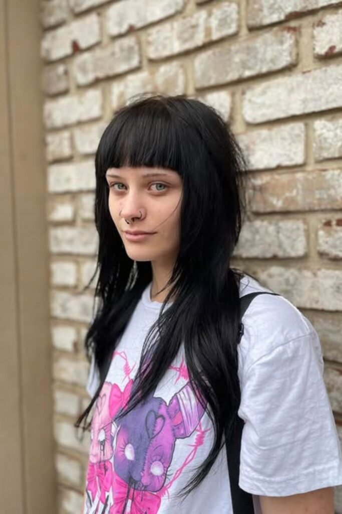 Tiny cropped bangs shift the whole energy of a long shag in seconds. The spiky fringe keeps the front edgy, and the straight, loose length stays soft and undone.