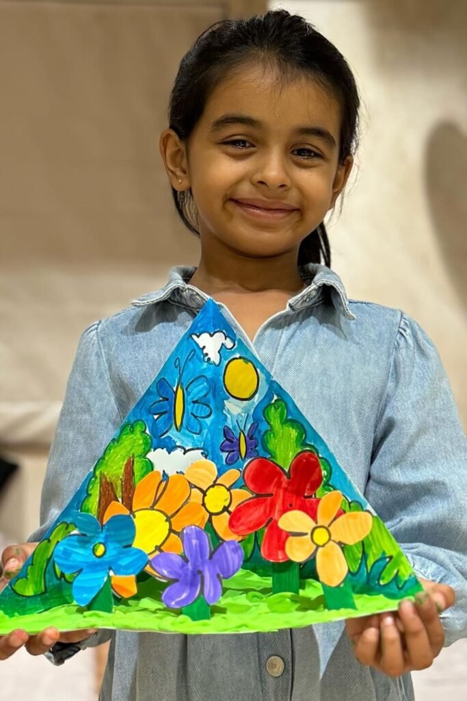 Triangular paper instantly changes how kids think about space. Garden scenes fit well for calm afternoons when painting feel more relaxing than cutting.