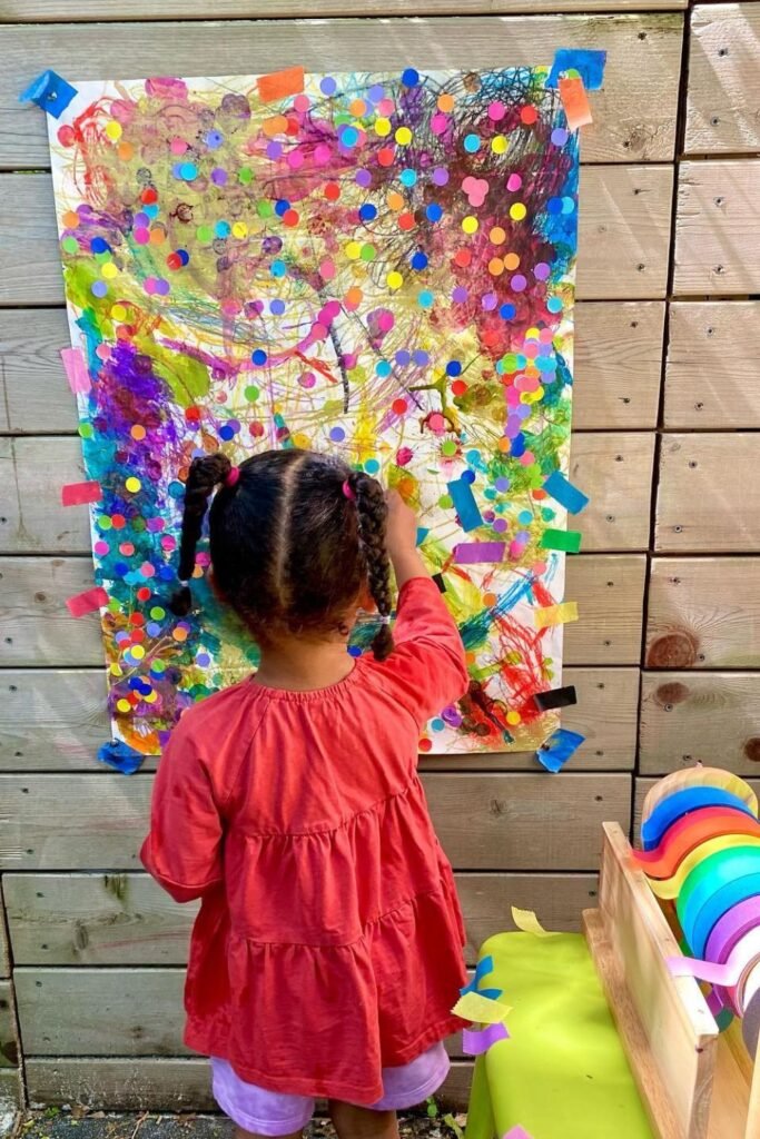 Tape a big sheet of paper to a wall or fence and then provide paint, stickers, or crayons.