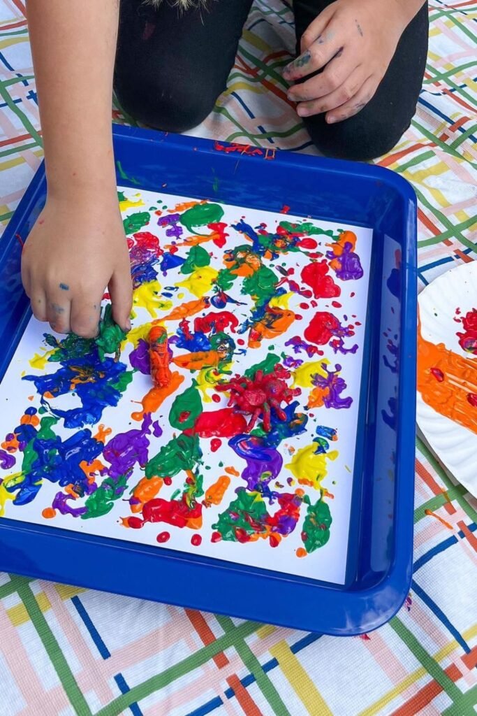 Paint feels different when brushes stay out of reach. Tray setups work best for toddlers and younger kids because the mess stays contained.