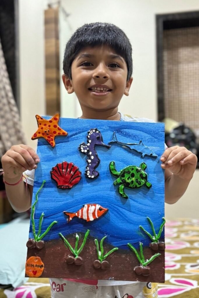 Craft fish, shells and plants using air dry clay or thick paint and then affix them to a painted surface. Allow the pieces to cure completely.