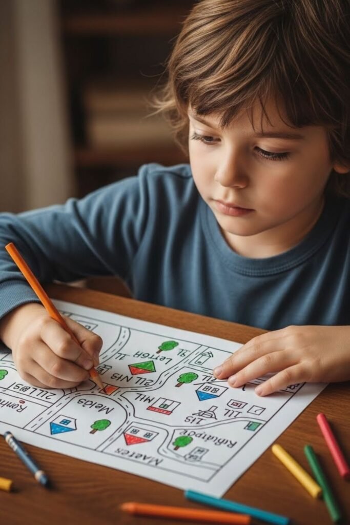 Personal spaces turn into art without needing drawing skills. Ask kids to draw simple maps of places they know bedroom, playground, grandma’s house using symbols.