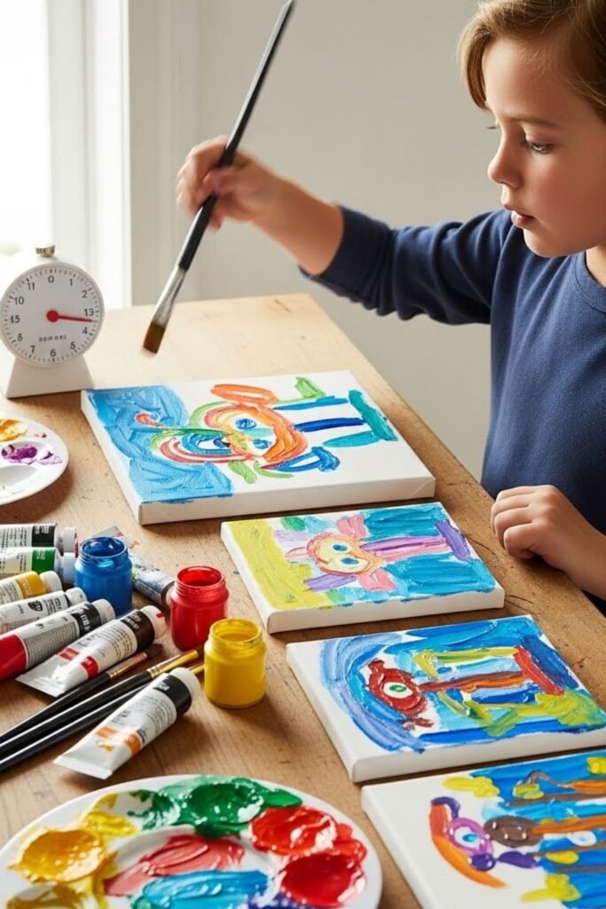 Speed changes the outcome completely. Set short timers 30 seconds, one minute, three minutes and let kids paint the same subject each round.