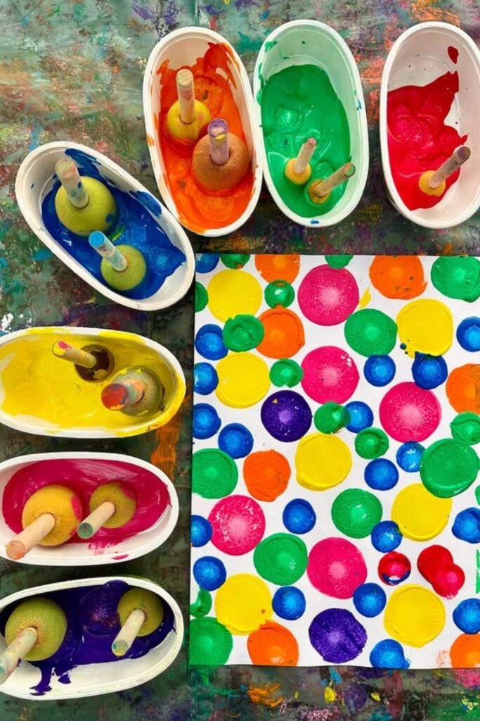 Circles made with sponges keep kids focused without needing drawing skills. This activity fits perfectly on rainy days or short attention spans.