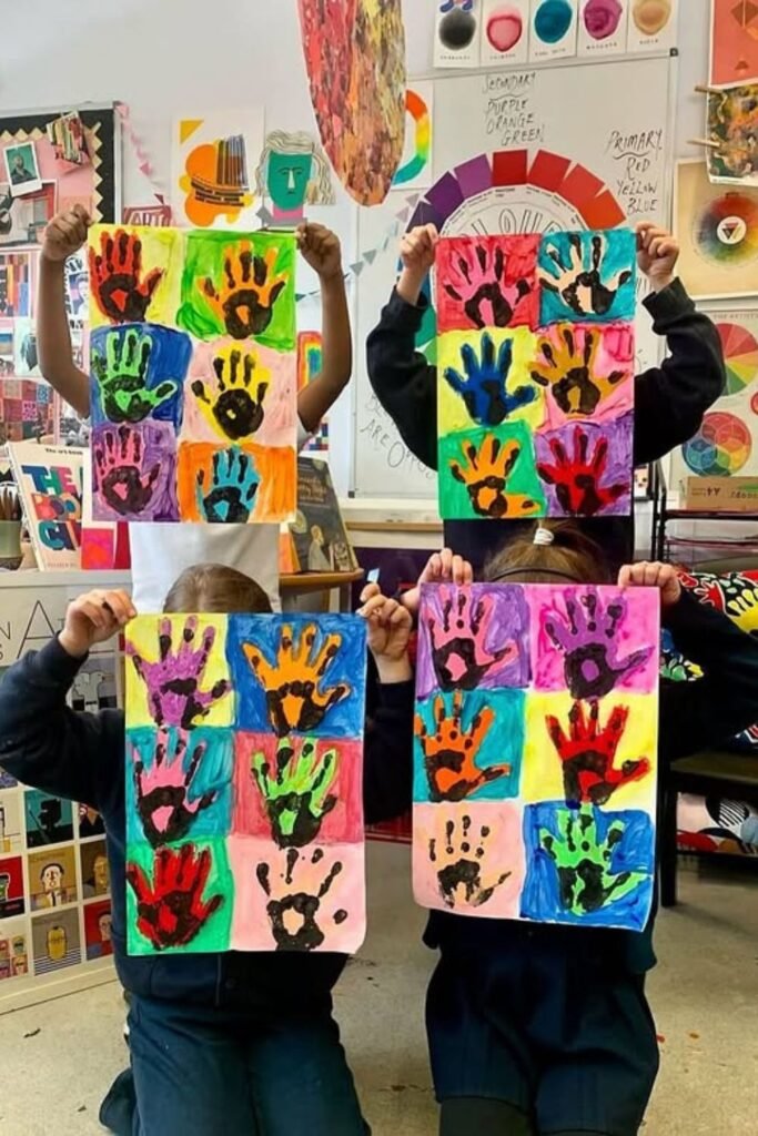 Choose a handful of vibrant hues, then paint your hands and press them onto paper that’s been sectioned off.
