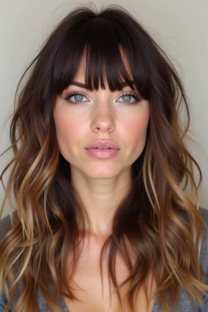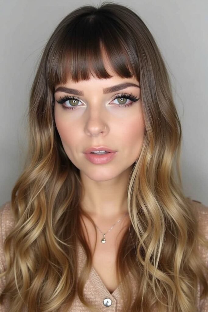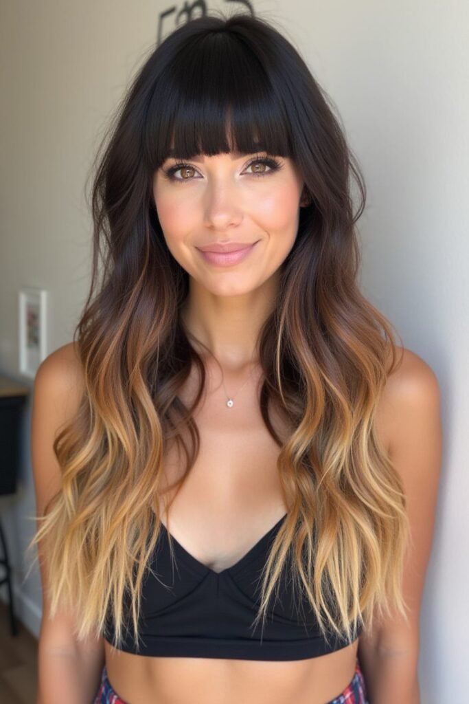 Create a stunning contrast with soft ombre waves and straight, blunt baby bangs.