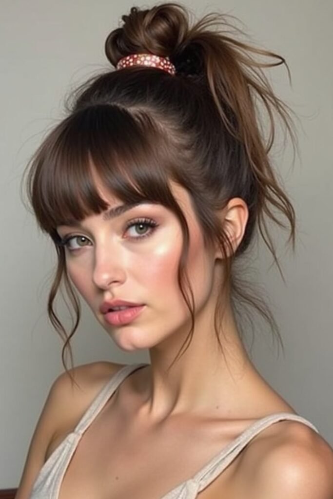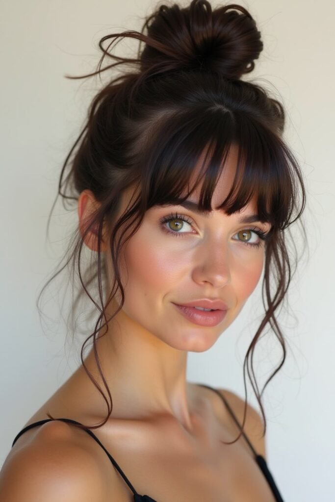 Get that effortless beauty with a messy high bun, complemented by baby bangs and soft face-framing strands.