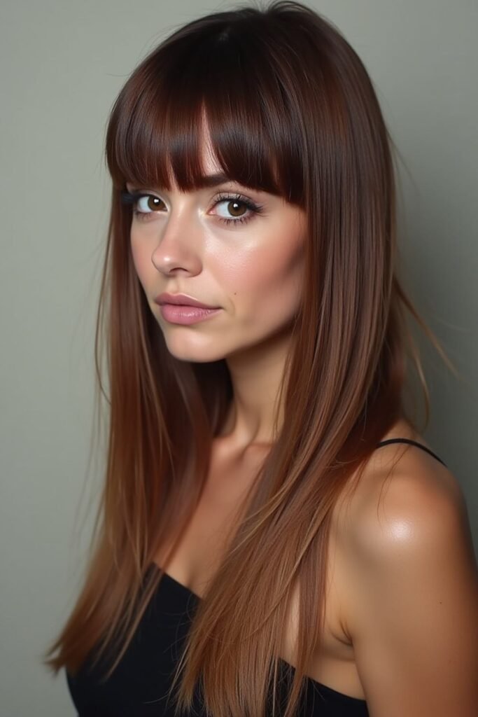 Make a bold statement with rich auburn tones and precise baby bangs on long, straight hair.