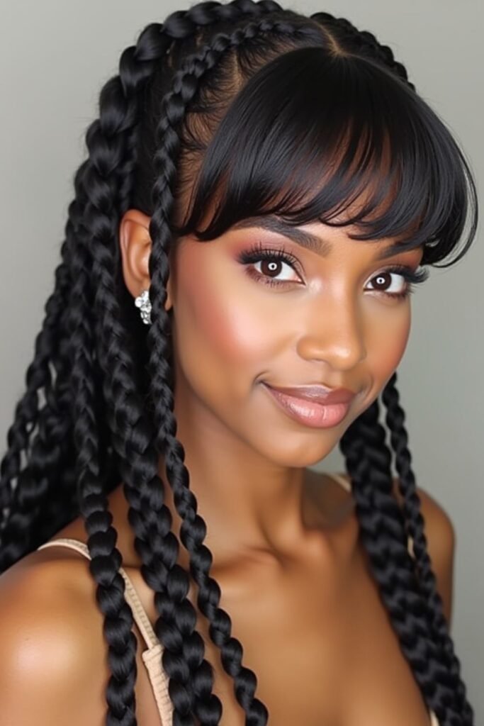 The bold braids create a dramatic look, while the soft fringe gently frames your face, adding a touch of romance.