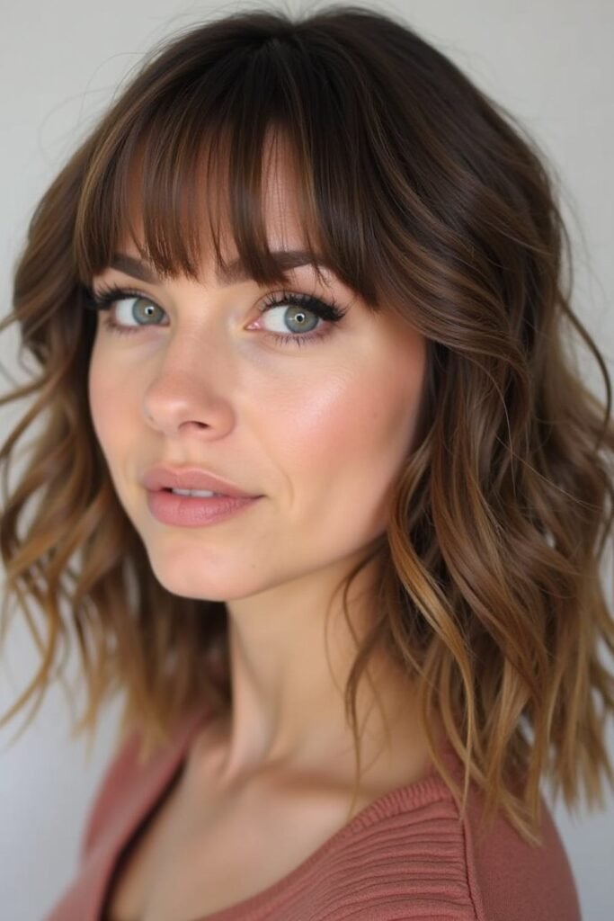 This style is ideal for anyone who loves a casual yet elegant touch. Create loose waves and shape the bangs into a soft, feathered finish.
