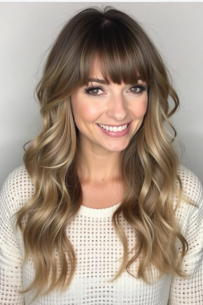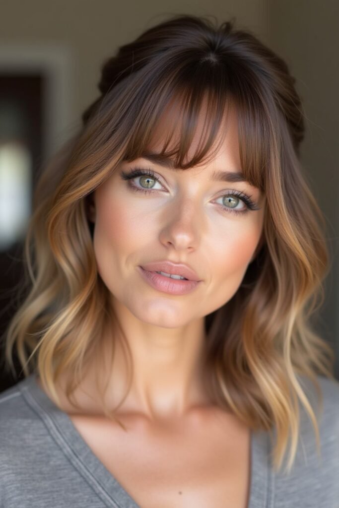 Set a breezy tone with a beachy balayage blending caramel and blonde hues, paired with textured baby bangs.