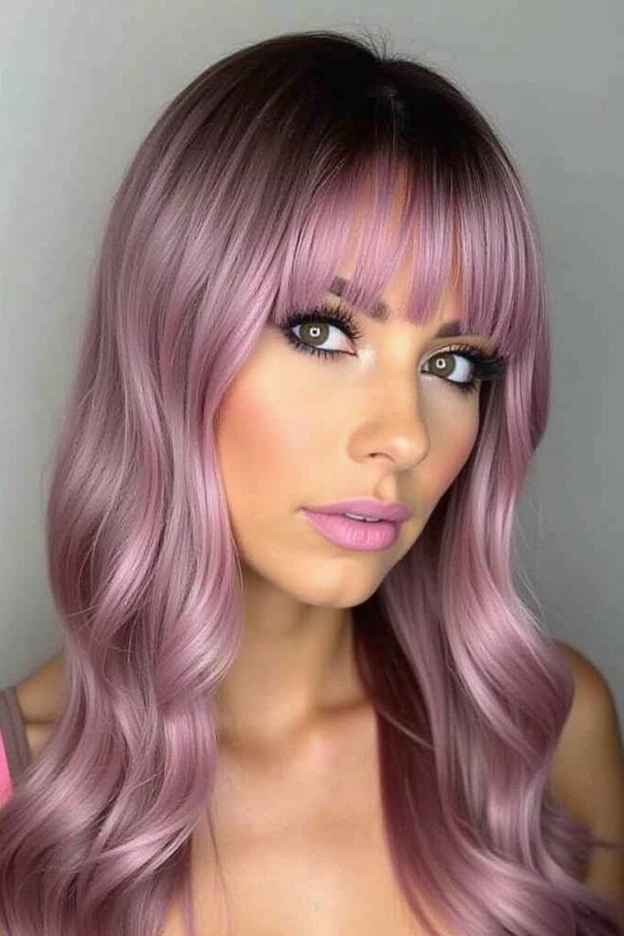Transform your look with soft lavender waves paired with sleek baby bangs for an ethereal yet bold vibe.