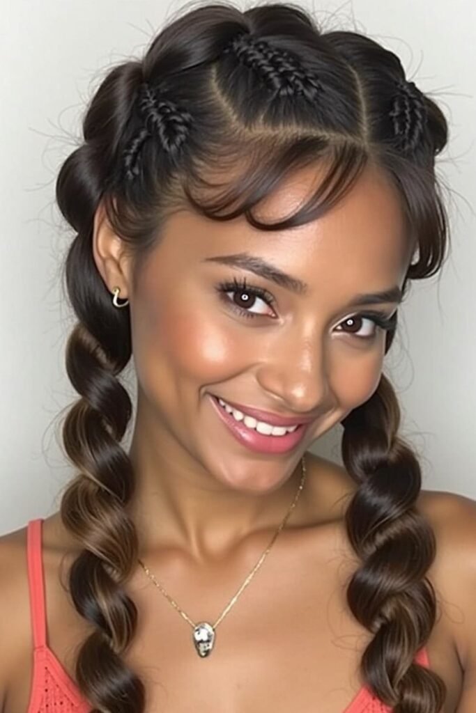 Combine double braids with wispy baby bangs for a fun and youthful flair.