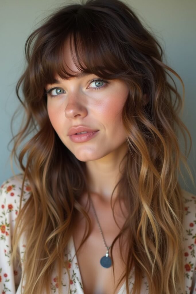 For a romantic, effortless appeal, combine soft tousled waves with airy, feathered baby bangs.