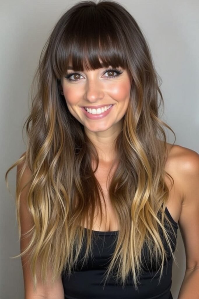 Elevate your style with ombre-dyed long hair complemented by precise baby bangs.