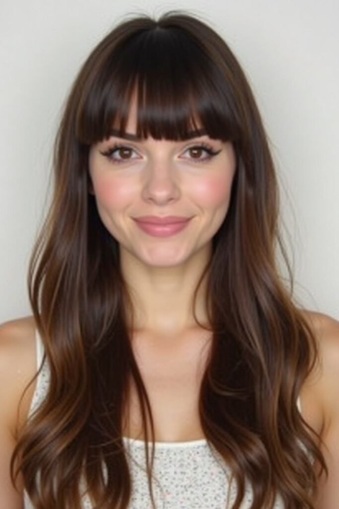 21. Glossy Chocolate Brown Baby Bangs with Long Layers