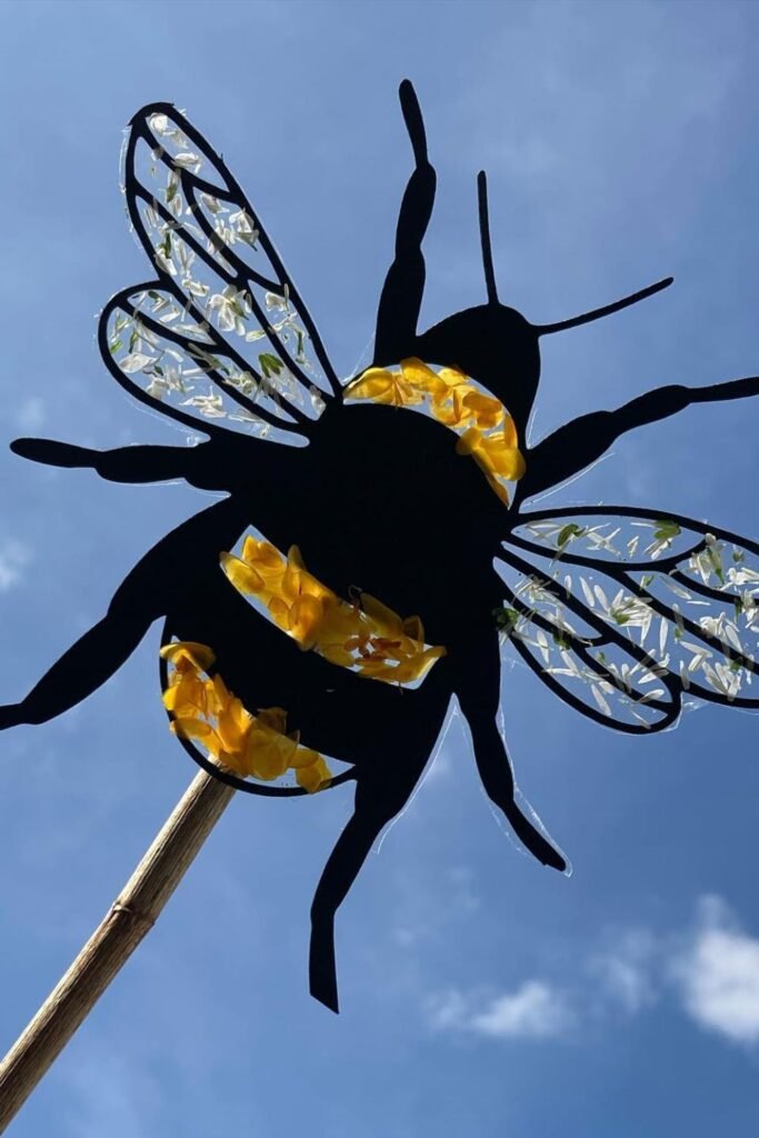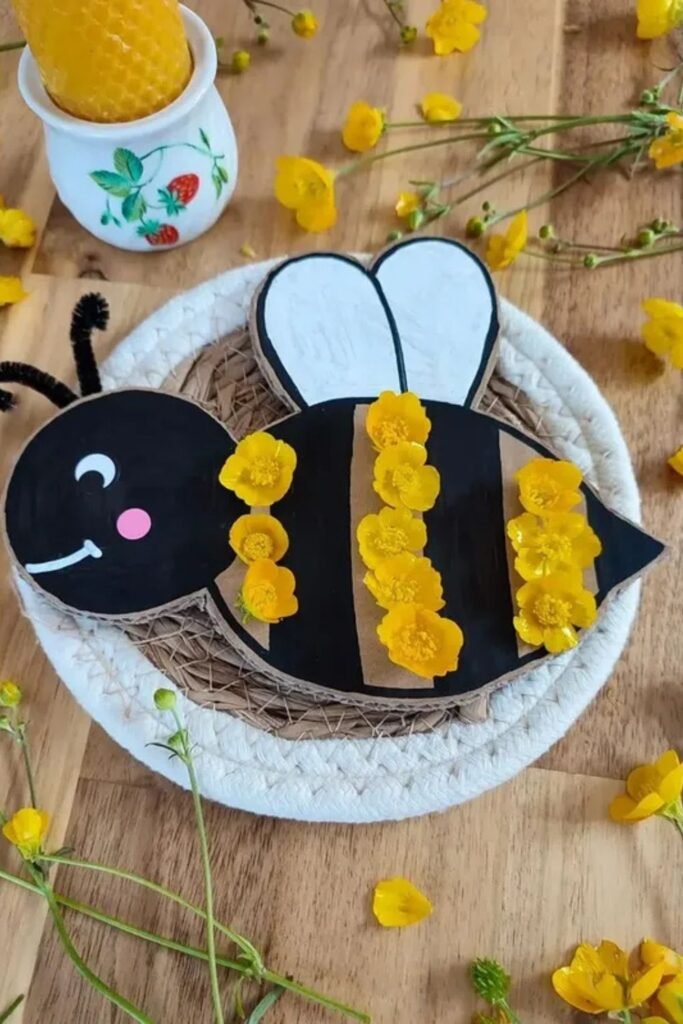 Real flowers turn a simple bee shape into something kids slow down for. Pressed or fresh yellow flowers work as stripes.
