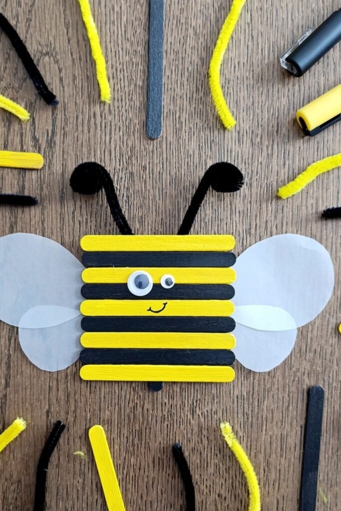 Straight lines make this bee feel easier than it looks. Lining up craft sticks gives kids instant structure.