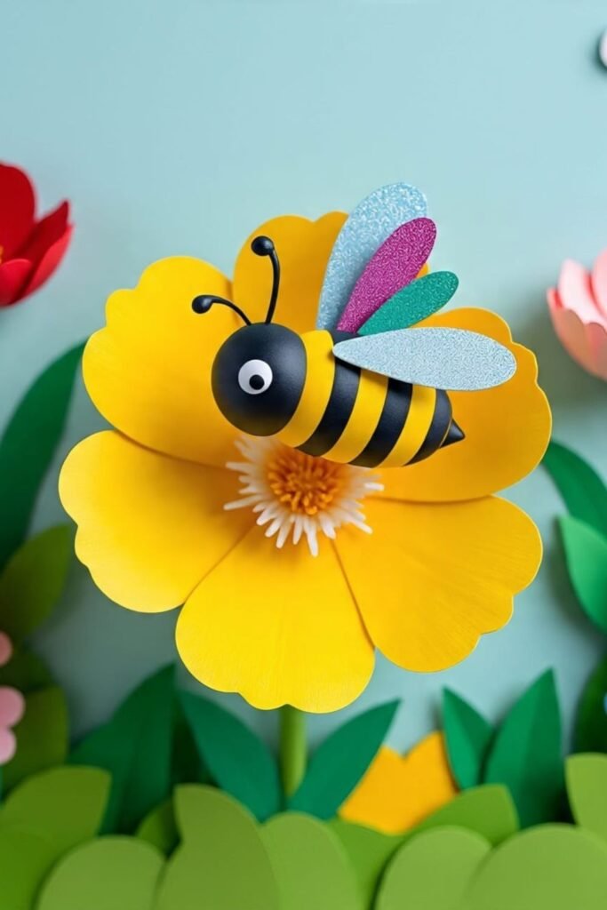 Cut out layered petals from colorful paper, glue on a textured center and then put a miniature striped bee on top as if it just landed.