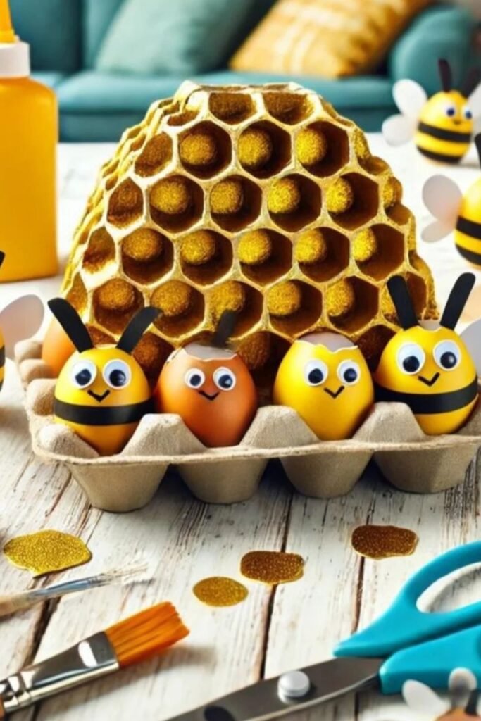 Egg cartons quietly solve two problems at once: structure and shape. The cup already looks like a bee body.