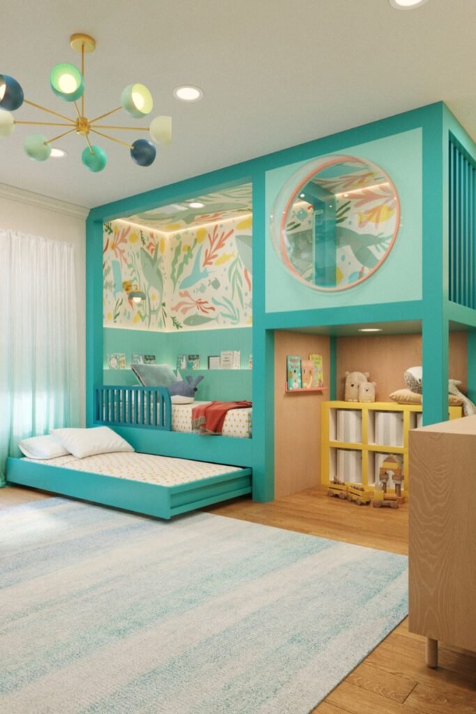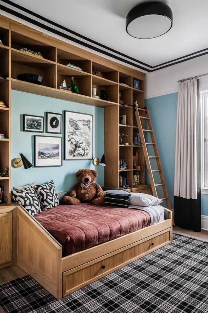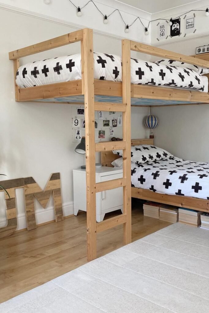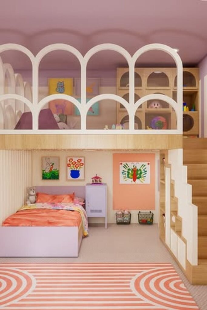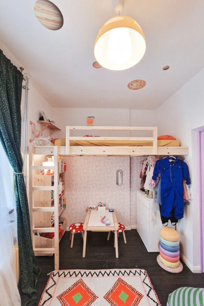 This kind of vertical planning converts one small corner into a whole sleep, play, and storage area that works.