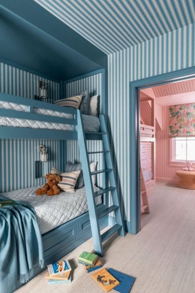 The striped wallpaper goes all the way across the walls and ceiling, which makes the bunks feel like they are part of the building, not just furniture.