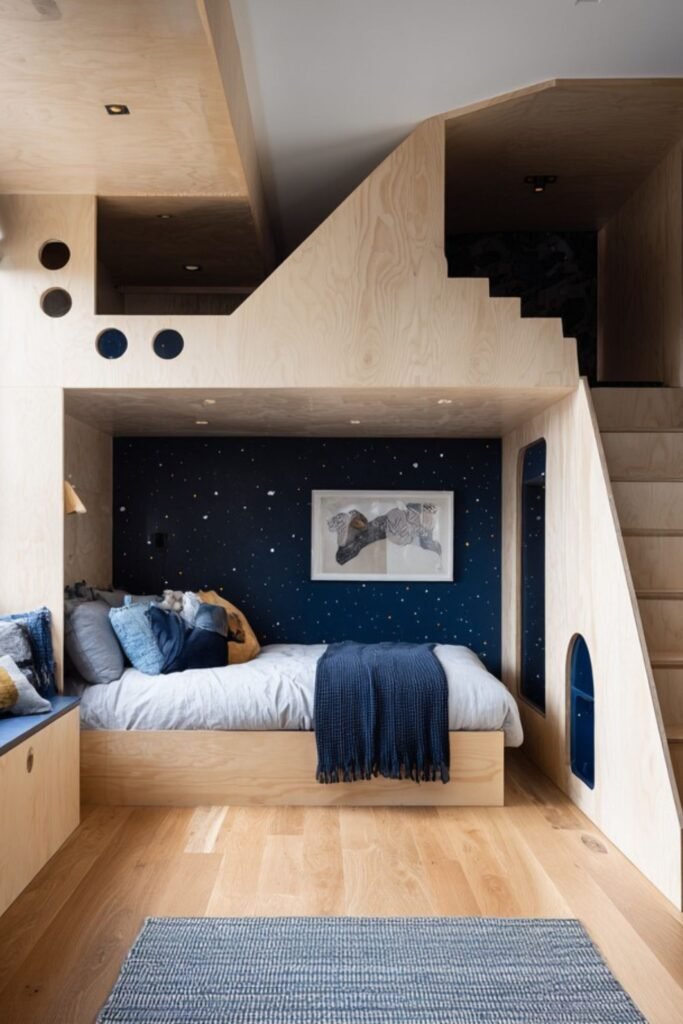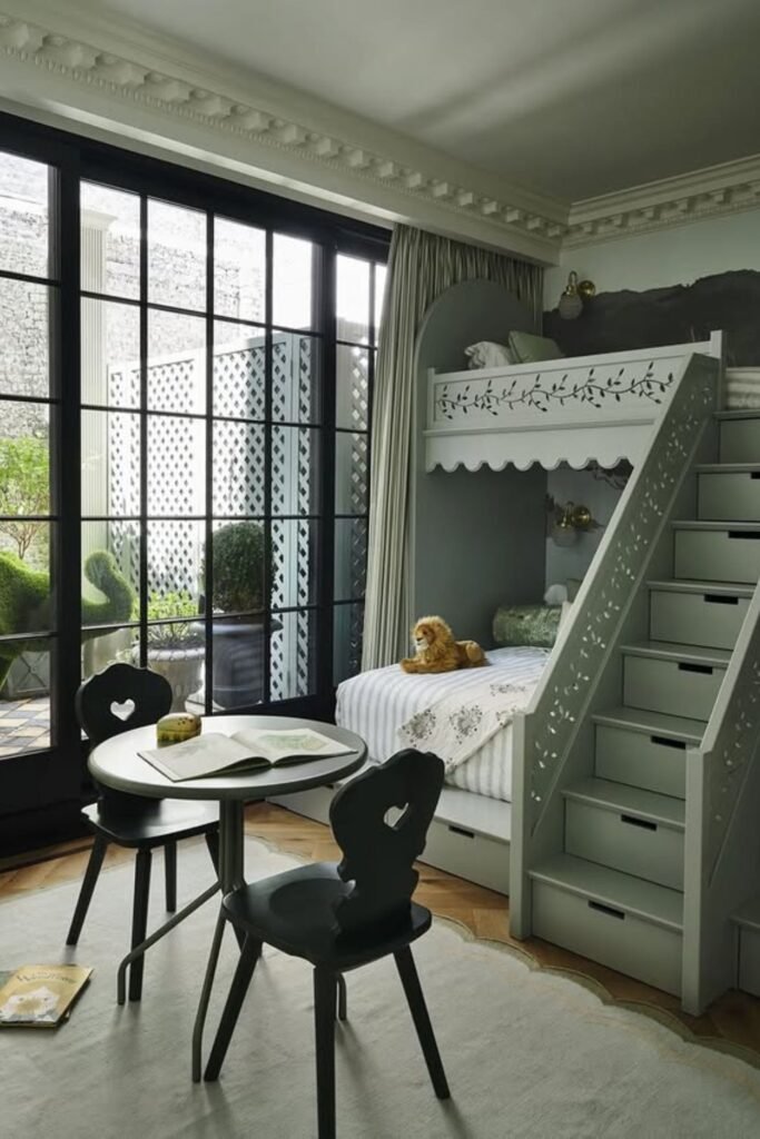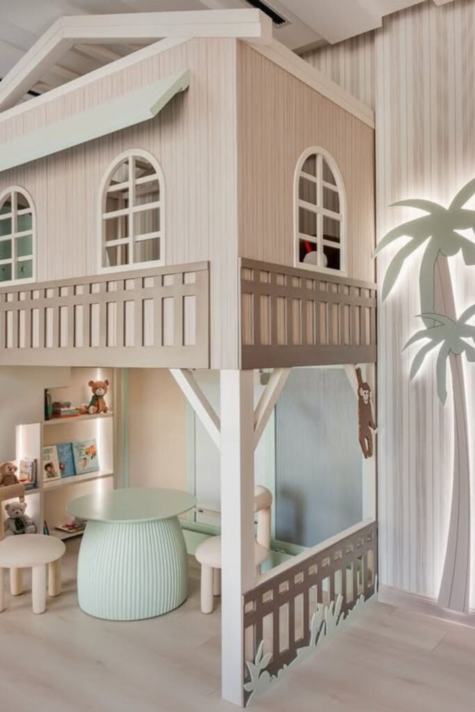 Childhood feels bigger when the bed becomes a house. A raised treehouse-style loft instantly creates two levels of living without needing a large footprint.