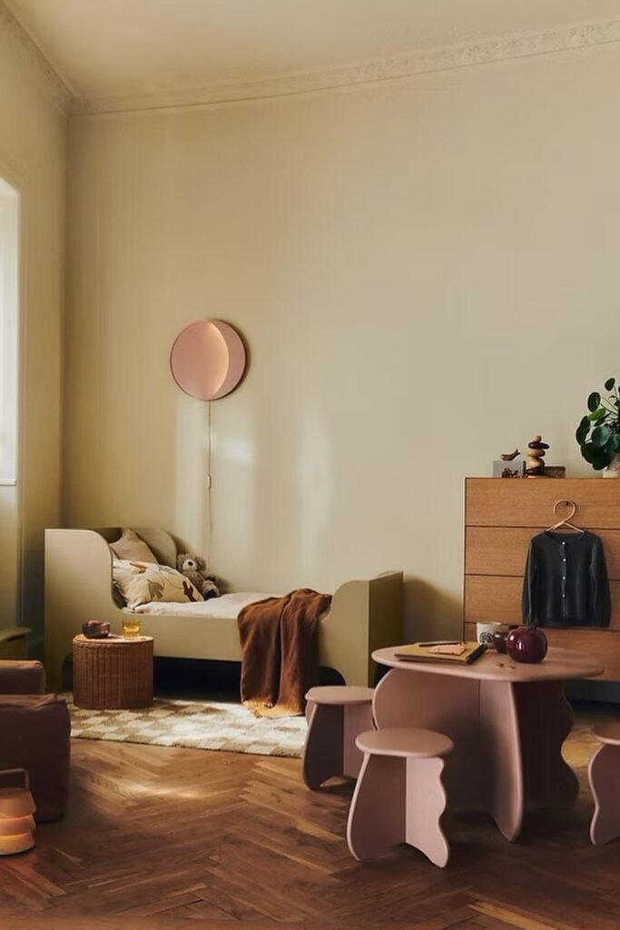 Noise drops the moment a room feels simple. Clean walls, low bed, and soft earthy colors create a space that helps kids wind down instead of overstimulating them.