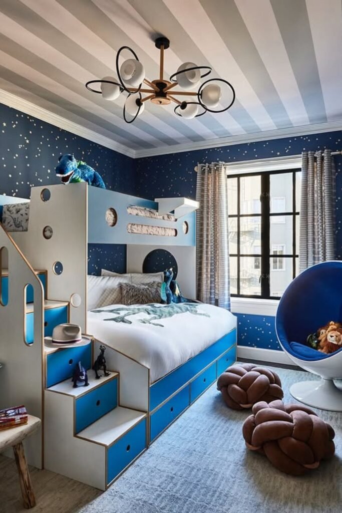 Energy changes when the whole room follows one strong theme. Deep blue walls with tiny stars create a night-sky backdrop that feels immersive without being overwhelming.