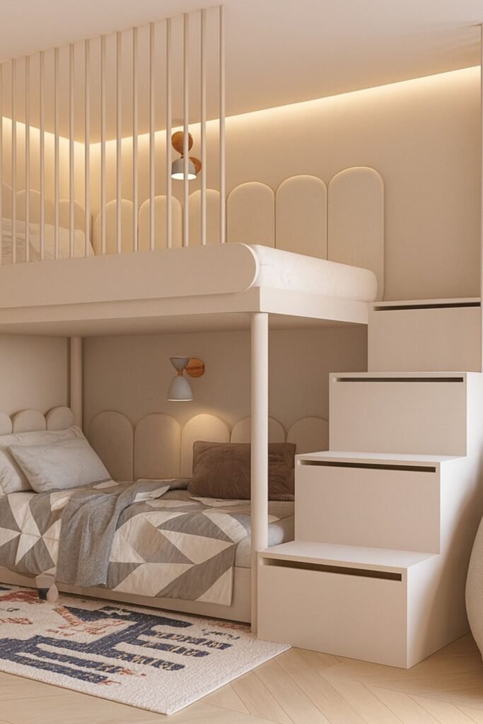 Privacy changes everything in a shared room. Built-in bunk alcoves like this give each child a clear personal zone without needing extra square footage.