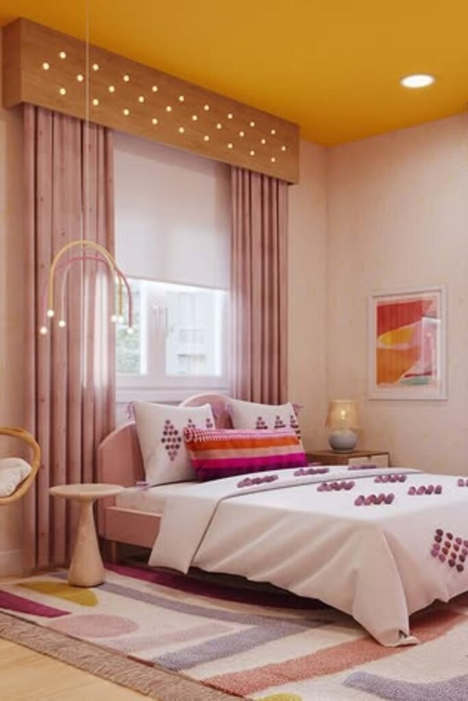 Warm light can change the whole mood of a bedroom. Soft ceiling color paired with subtle string lights above the windows makes the space feel inviting.