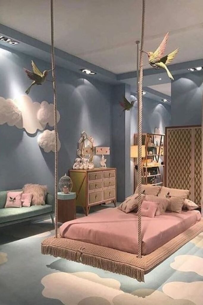 Gravity doesn’t get to decide how fun a bedroom feels. A suspended bed like this instantly turns sleep into an experience, not just a routine.