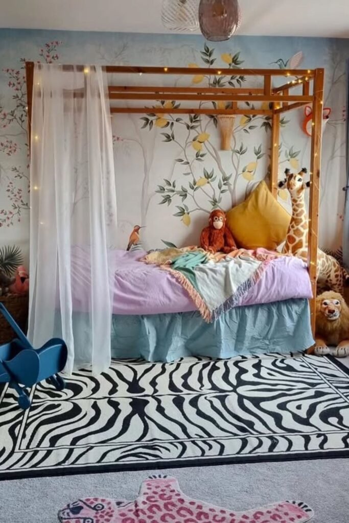Bedtime feels different when the bed becomes a soft retreat. A simple canopy frame with light curtains adds privacy without closing the room off.
