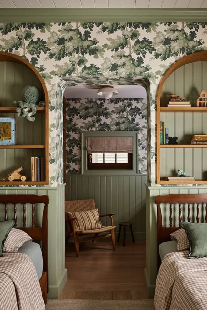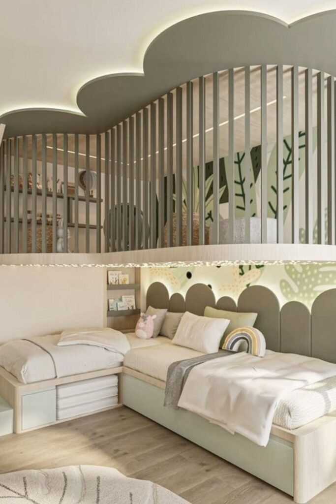 Sharing space doesn’t mean losing privacy. Built-in arches between two beds create a soft divider that separates each child’s zone without building a full wall.