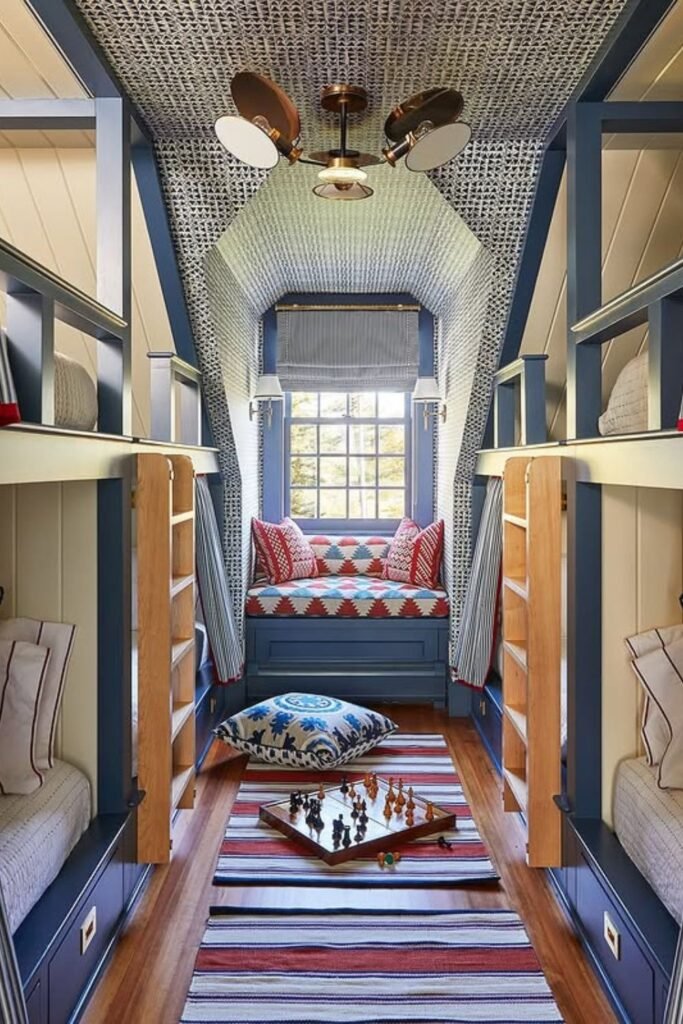 Color can define a space before furniture ever does. Deep blue paneling wrapped around built-in bunks instantly creates a sleep zone that feels tucked away and intentional.