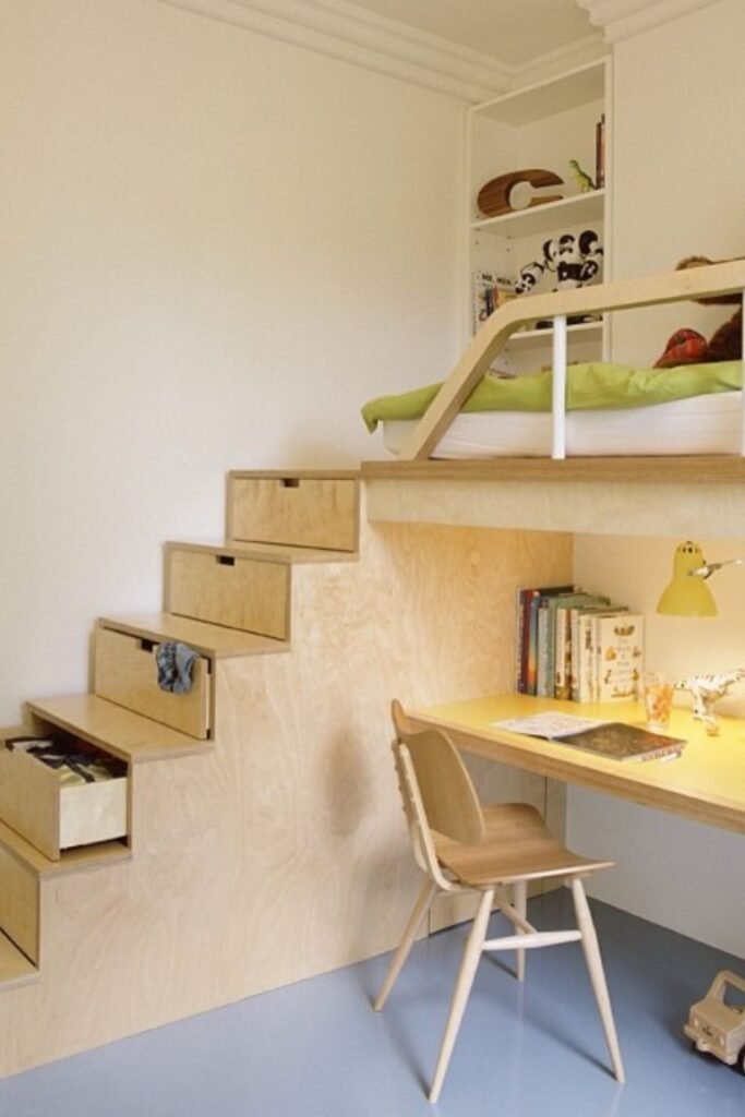 Each step turns into a drawer for clothes, toys, or school supplies. This keeps the floor clear and makes the room easy to clean.