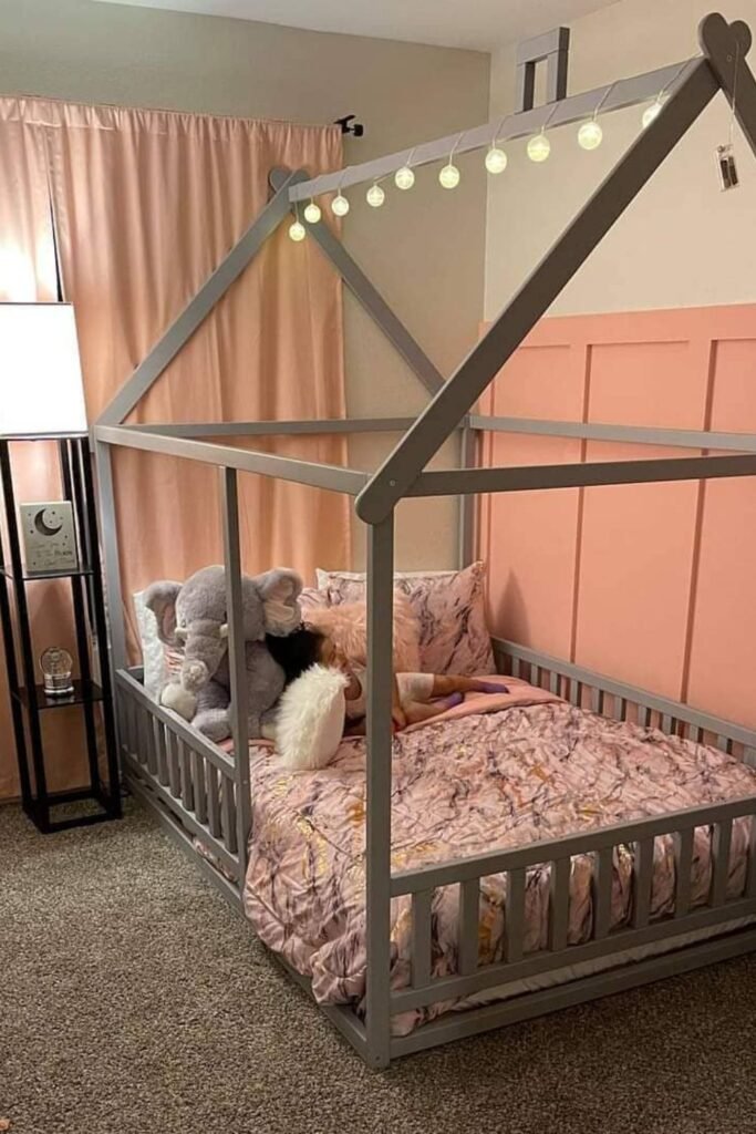 Shaping the bed like a miniature house gives the space a fun, age-appropriate ambiance while yet being clean and organized.
